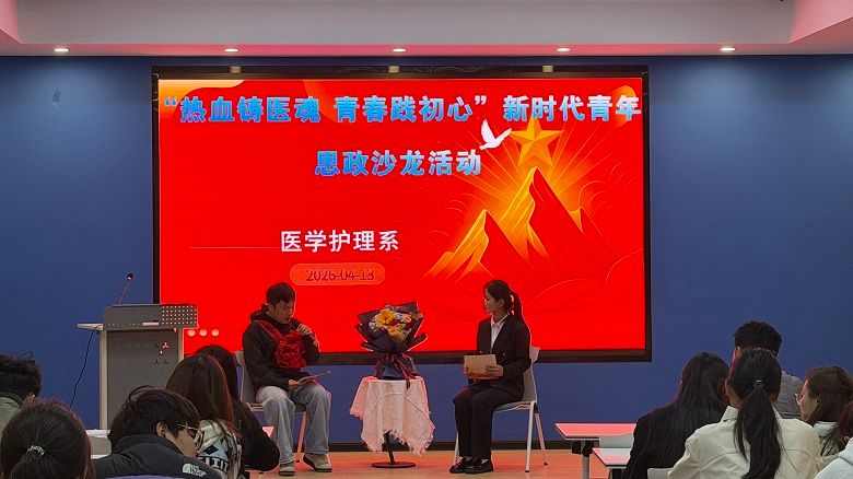 4月13日,“热血铸医魂,青春践初心”医学护理系新时代青年思政沙龙活动在一站式学生服务中心举办。德驭医疗马鞍山总医院重症医学科护士、2026年安徽省首例造血干细胞二次捐献者、2023届校友沈后岩重返母校,与学弟学妹展开了一场关于青春、责任与奉献的深度对话。